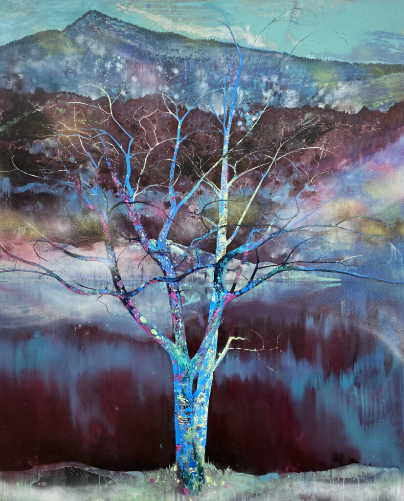 His paintings — enriched with glass beads, silver powder, and gold leaf — reflect an alpine memory: frozen lakes, mirrored mountains, suspended light.
